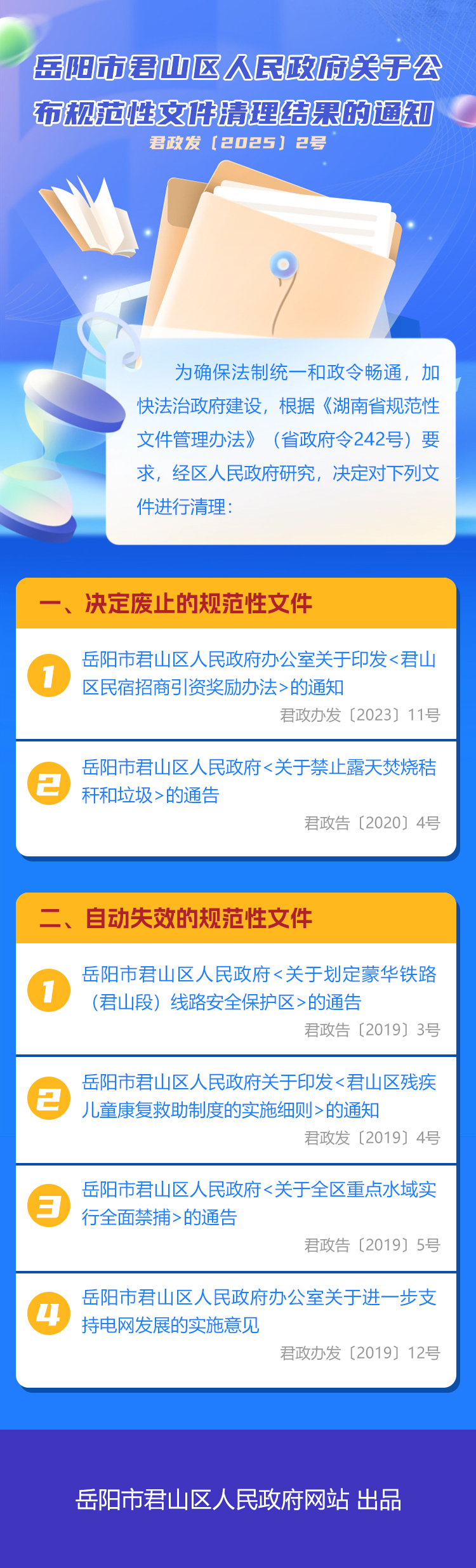 岳陽市君山區(qū)人民政府關(guān)于公布規(guī)范性文件清理結(jié)果的通知 君政發(fā)〔2025〕2號(hào)