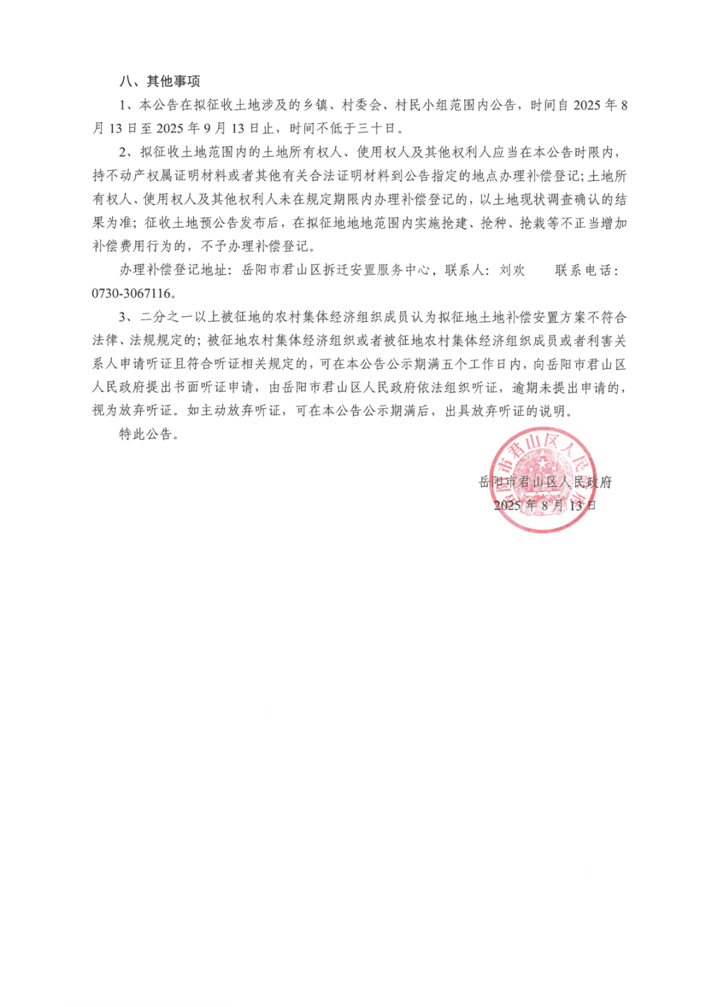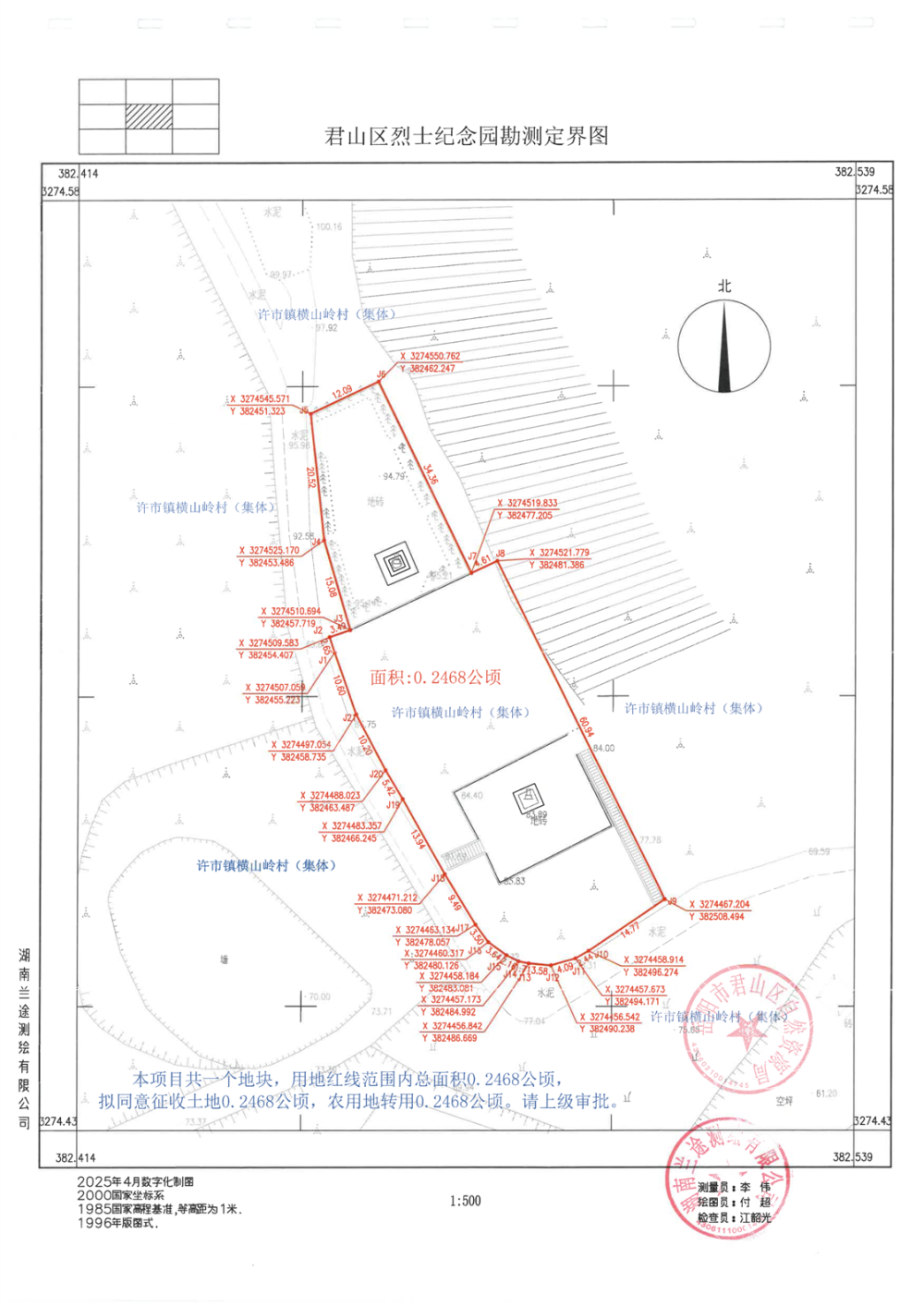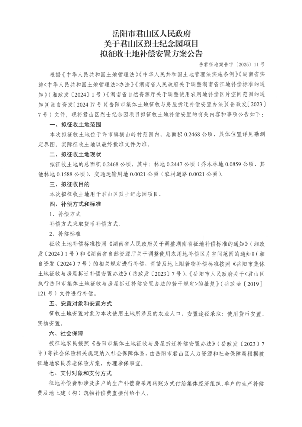 關(guān)于君山區(qū)烈士紀(jì)念園項(xiàng)目征收土地預(yù)公告、擬征收土地補(bǔ)償安置方案公告、勘測(cè)定界圖的公示