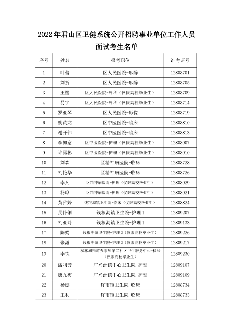 2022年君山區(qū)衛(wèi)健系統(tǒng)公開招聘事業(yè)單位工作人員面試公告
