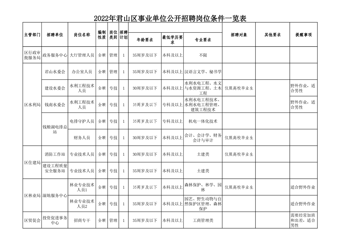 具體招聘崗位、計劃及要求詳見《2022年君山區(qū)事業(yè)單位公開招聘崗位表》(附件1)。