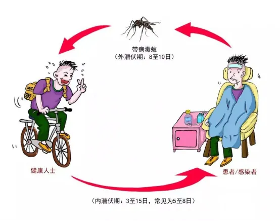 登革熱是由登革病毒引發(fā)、經(jīng)伊蚊(花斑蚊)叮咬傳播的急性傳染病,人與人之間無直接傳播,未被叮咬則不會感染。其傳播存在“外潛伏期”與“內(nèi)潛伏期”:攜帶病毒的伊蚊外潛伏期為8至10日,健康人被叮咬后,內(nèi)潛伏期為3至15日,常見為5至8日。
