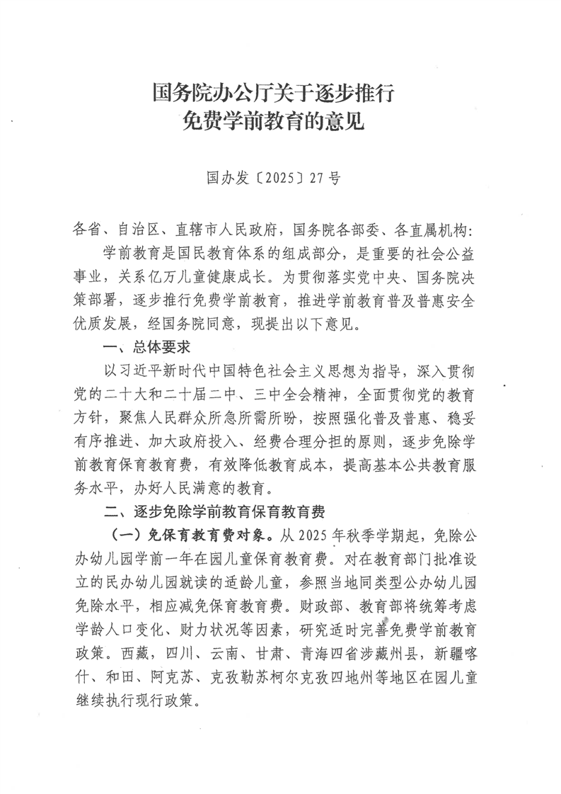 國(guó)務(wù)院辦公廳關(guān)于逐步推行免費(fèi)學(xué)前教育的意見