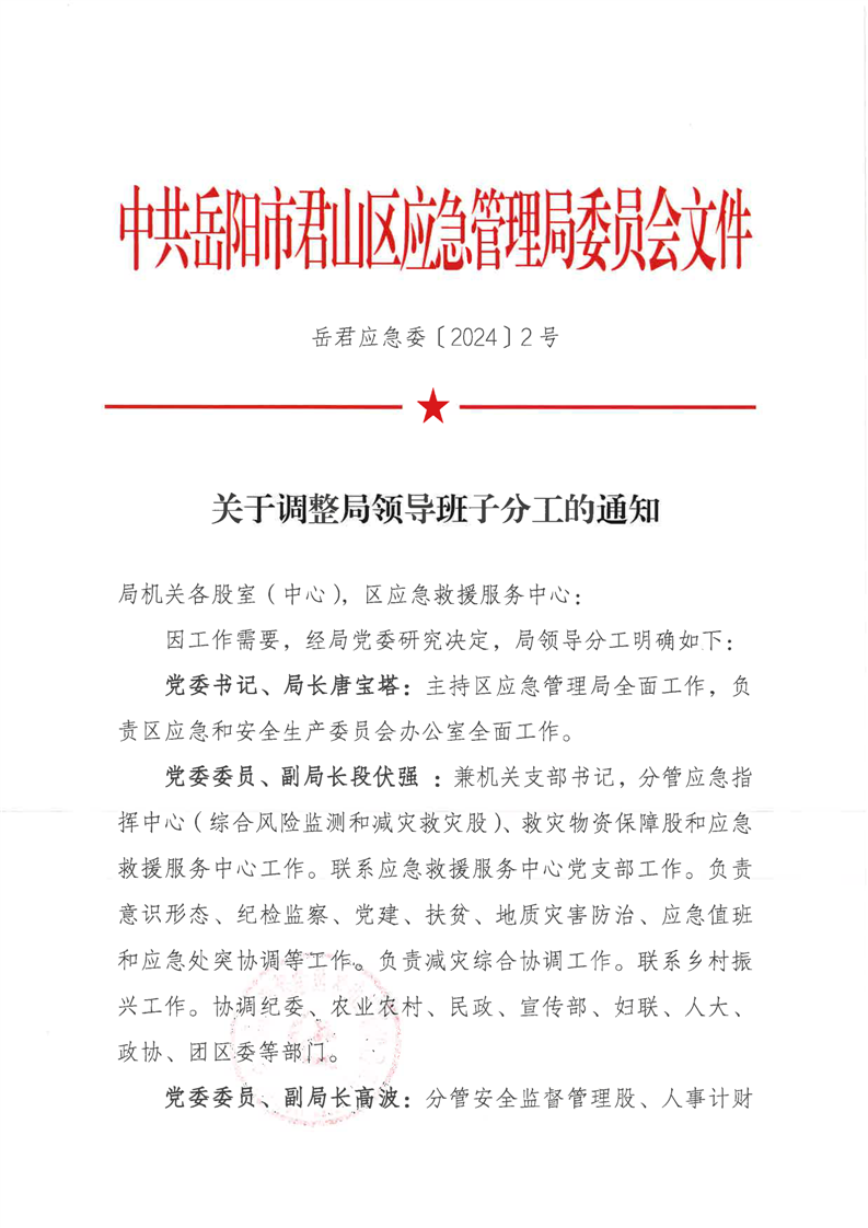 關(guān)于調(diào)整局領(lǐng)導班子分工的通知(岳君應(yīng)急委【2024】2號)
