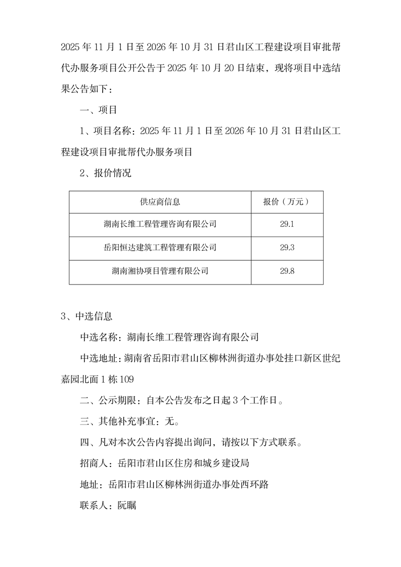 2025年11月1日至2026年10月31日君山區(qū)工程建設(shè)項(xiàng)目審批幫代辦服務(wù)項(xiàng)目公開招商中選公告
