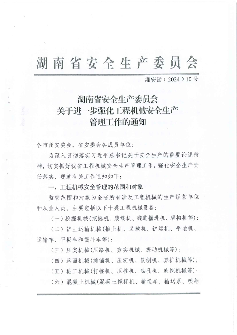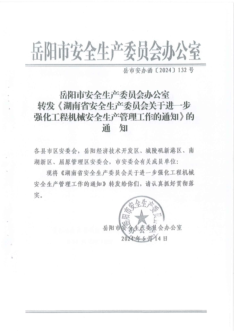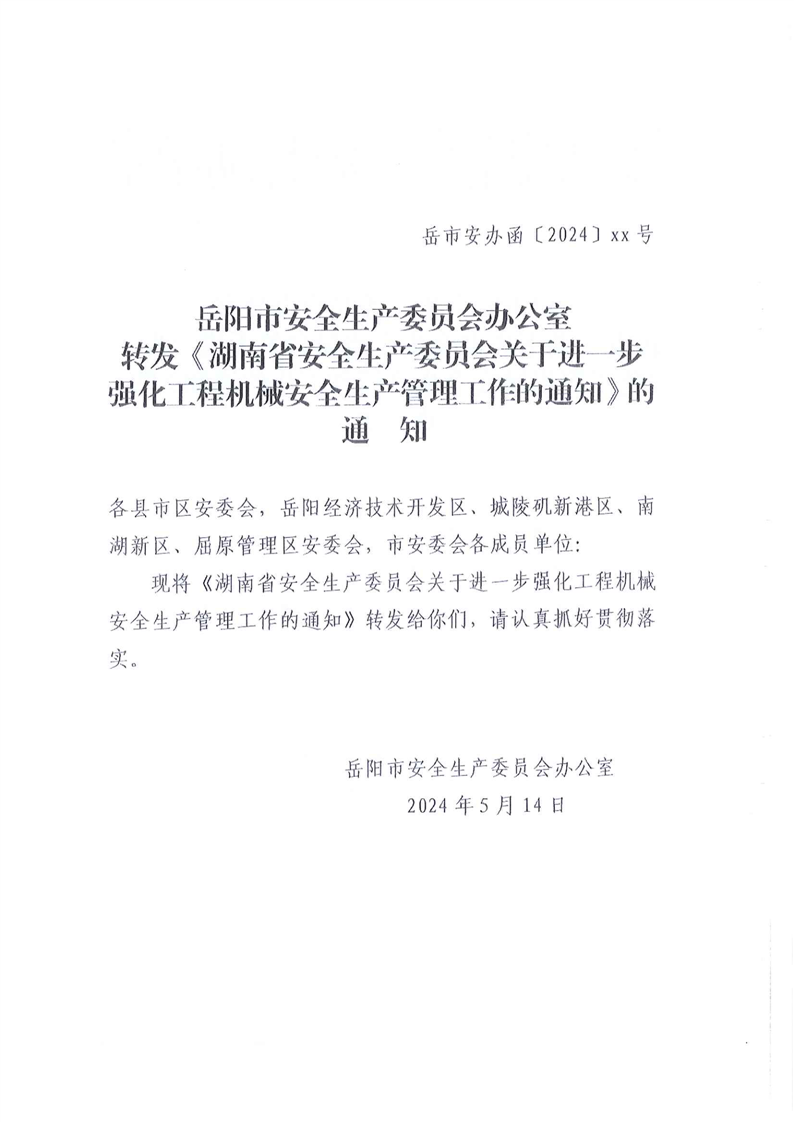 轉(zhuǎn)發(fā)《湖南省安全生產(chǎn)委員會關(guān)于進(jìn)一步強(qiáng)化工程機(jī)械安全生產(chǎn)管理工作的通知》的通知