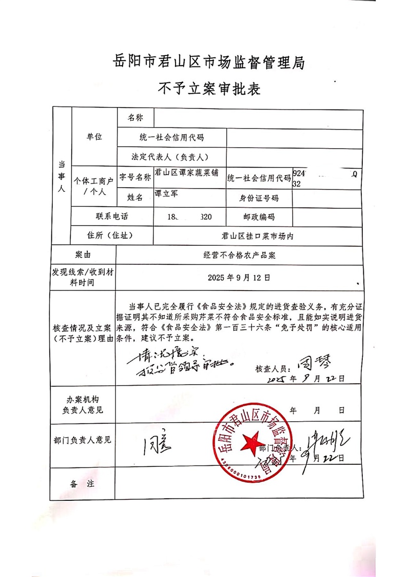 君山區(qū)市場(chǎng)監(jiān)督管理局不予立案審批表(君山區(qū)譚家蔬菜鋪)