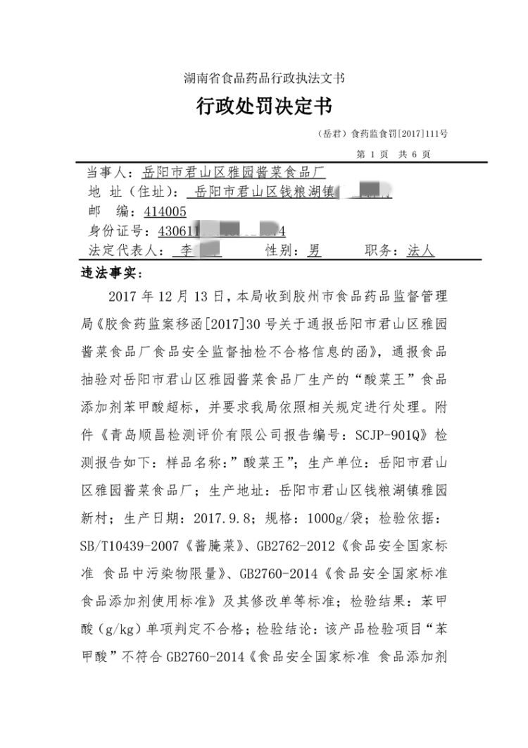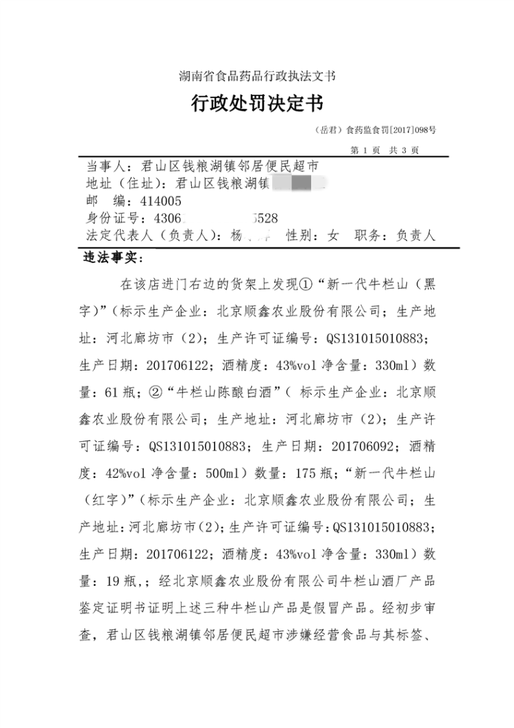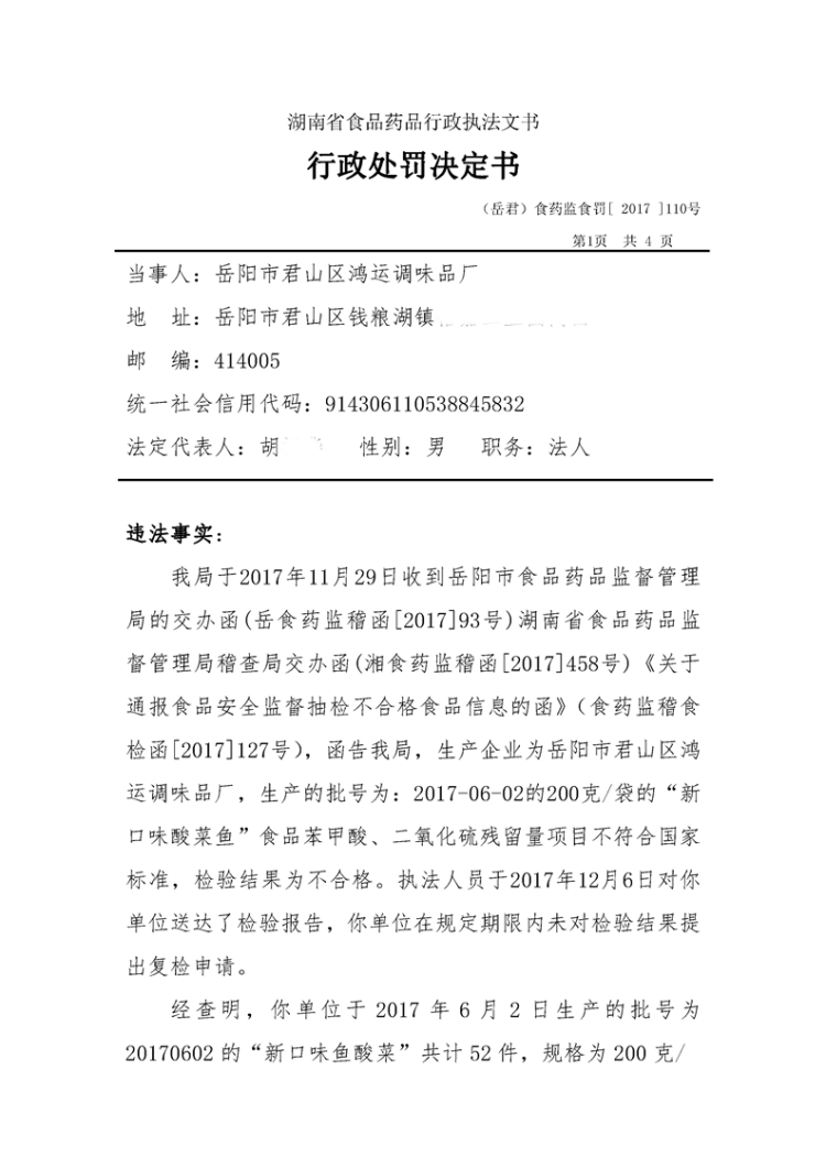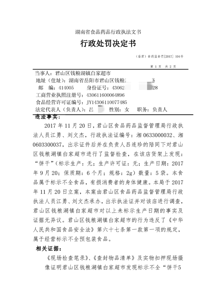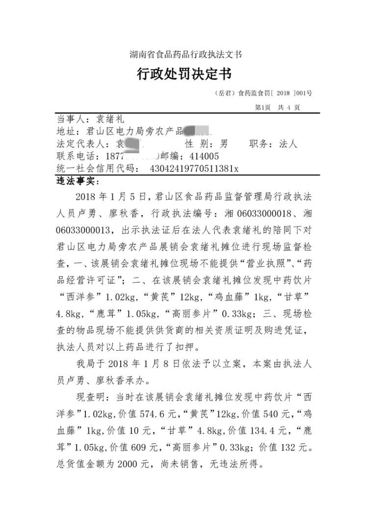 2018年1月君山區(qū)食品藥品行政處罰信息公開表及行政處罰決定書