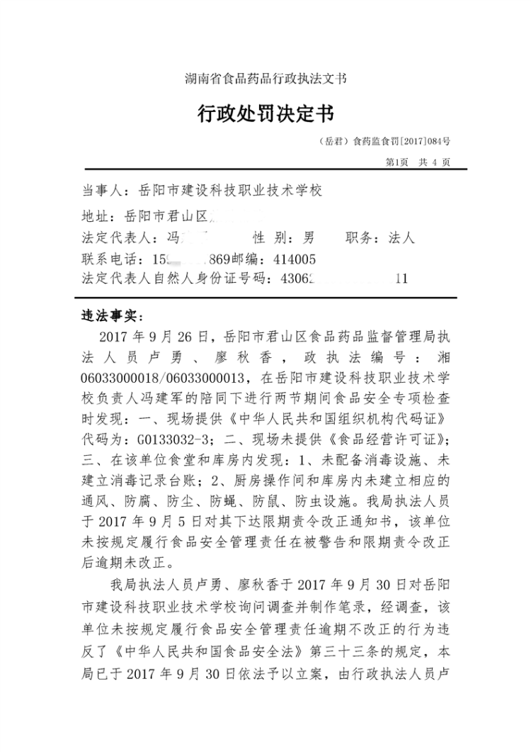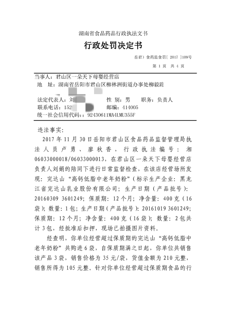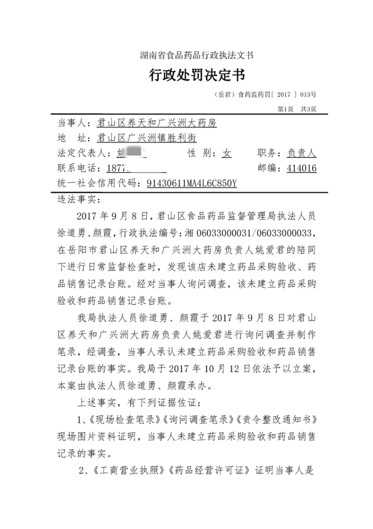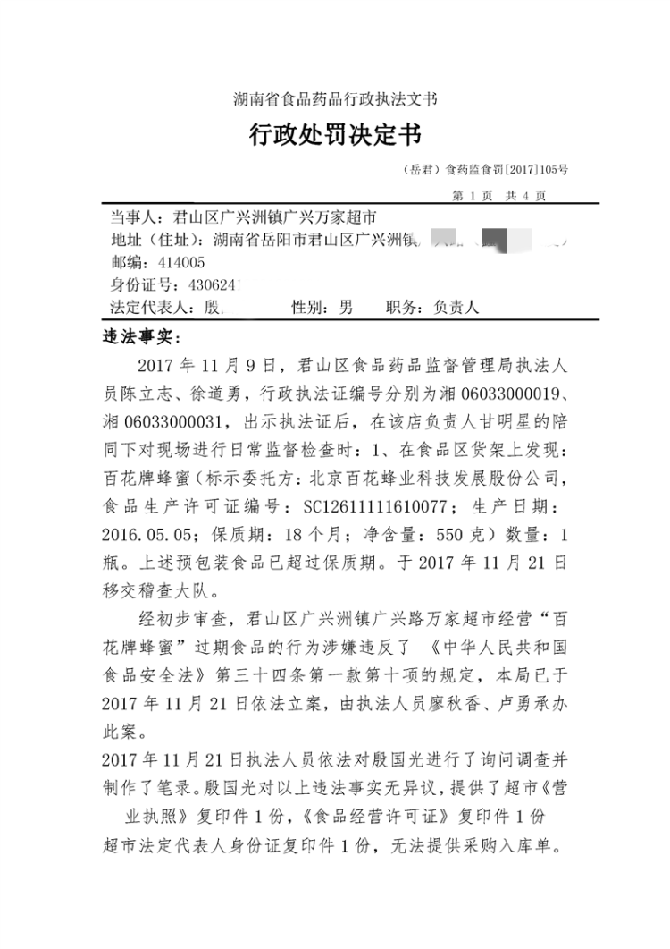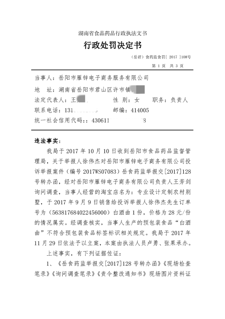 2018年1月君山區(qū)食品藥品行政處罰信息公開表及行政處罰決定書