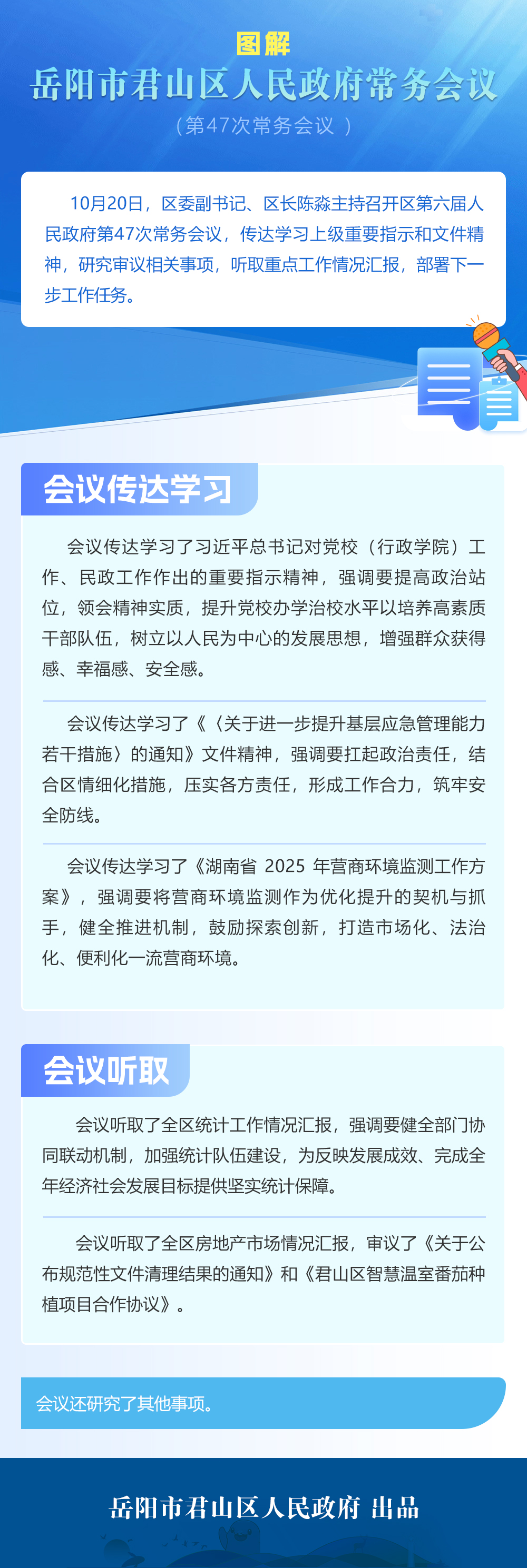 會議聽取了全區(qū)房地產(chǎn)市場情況匯報;審議了《關(guān)于公布規(guī)范性文件清理結(jié)果的通知》和《君山區(qū)智慧溫室番茄種植項目合作協(xié)議》。