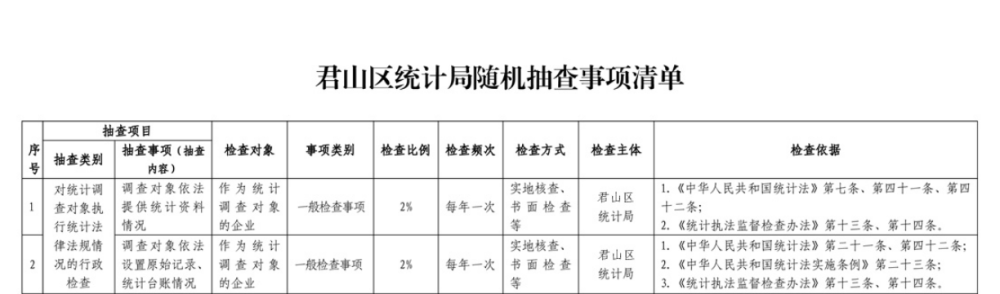 君山區(qū)統(tǒng)計局隨機抽查事項清單