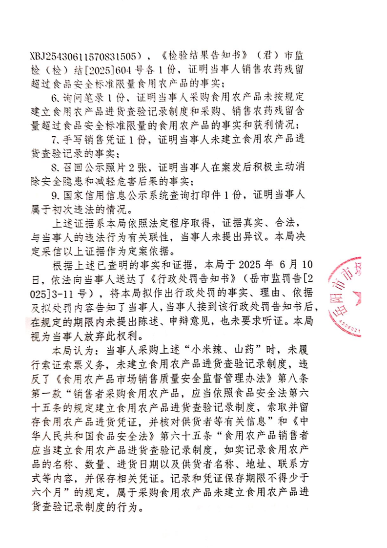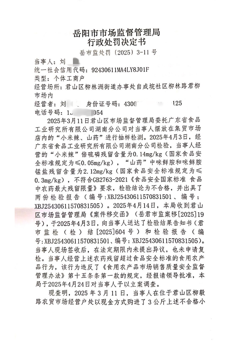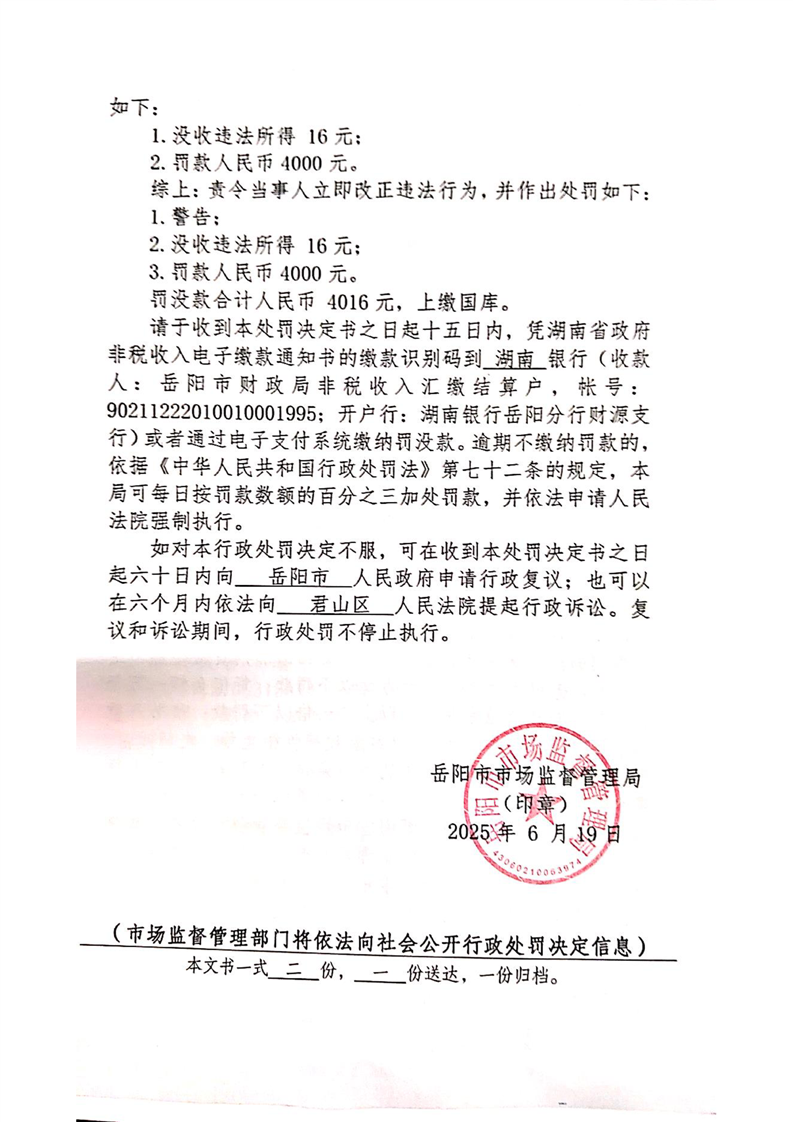 岳陽市市場監(jiān)督管理局行政處罰決定書 岳市監(jiān)處罰〔2025〕3-11號