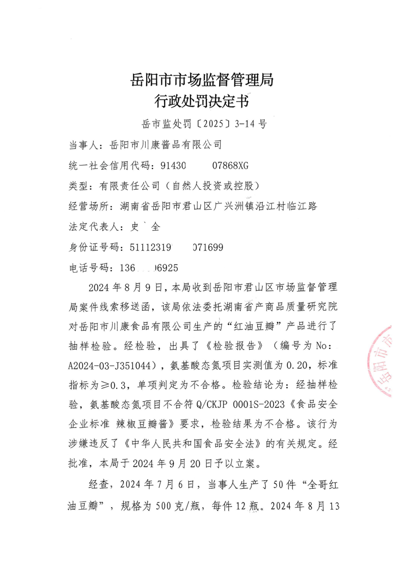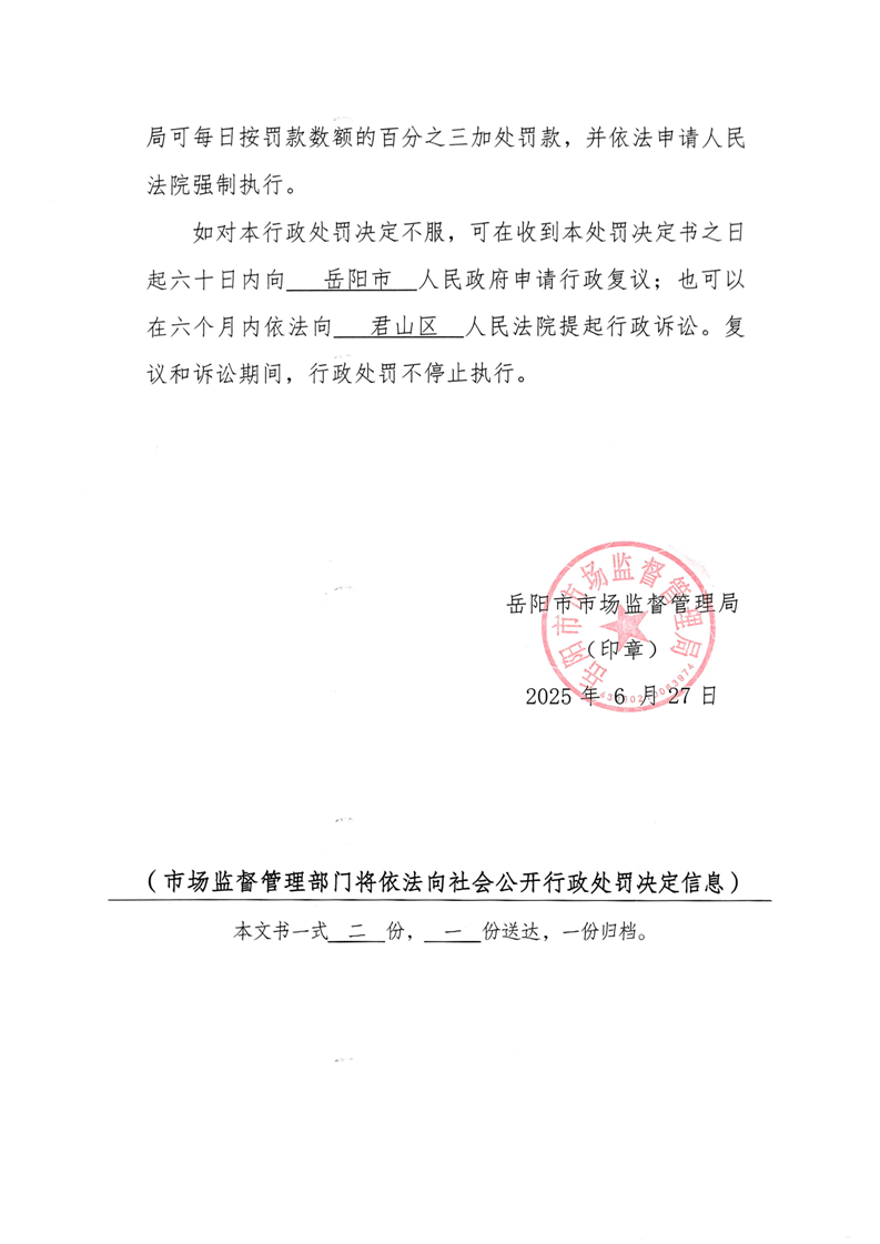 岳陽市市場(chǎng)監(jiān)督管理局行政處罰決定書岳市監(jiān)處罰【2025】3-14號(hào)