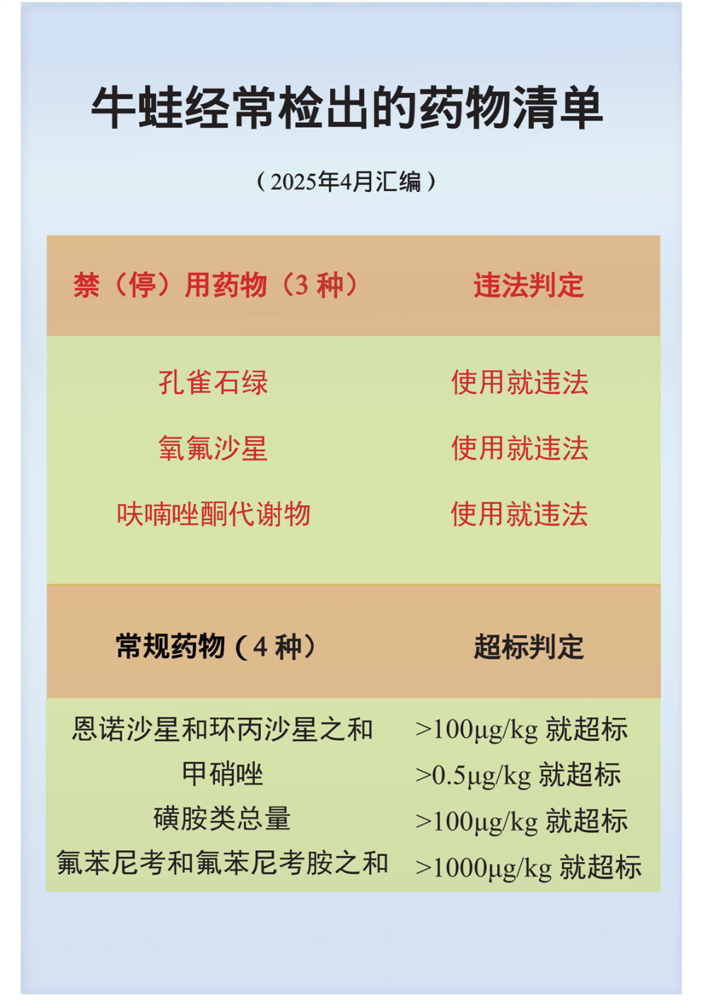 牛蛙經(jīng)常檢出的藥物清單