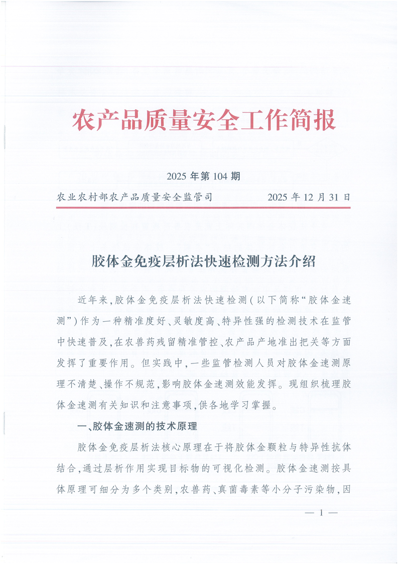 農(nóng)產(chǎn)品質(zhì)量安全工作簡(jiǎn)報(bào) 2025年第104期-膠體金免疫層析法快速檢測(cè)方法介紹